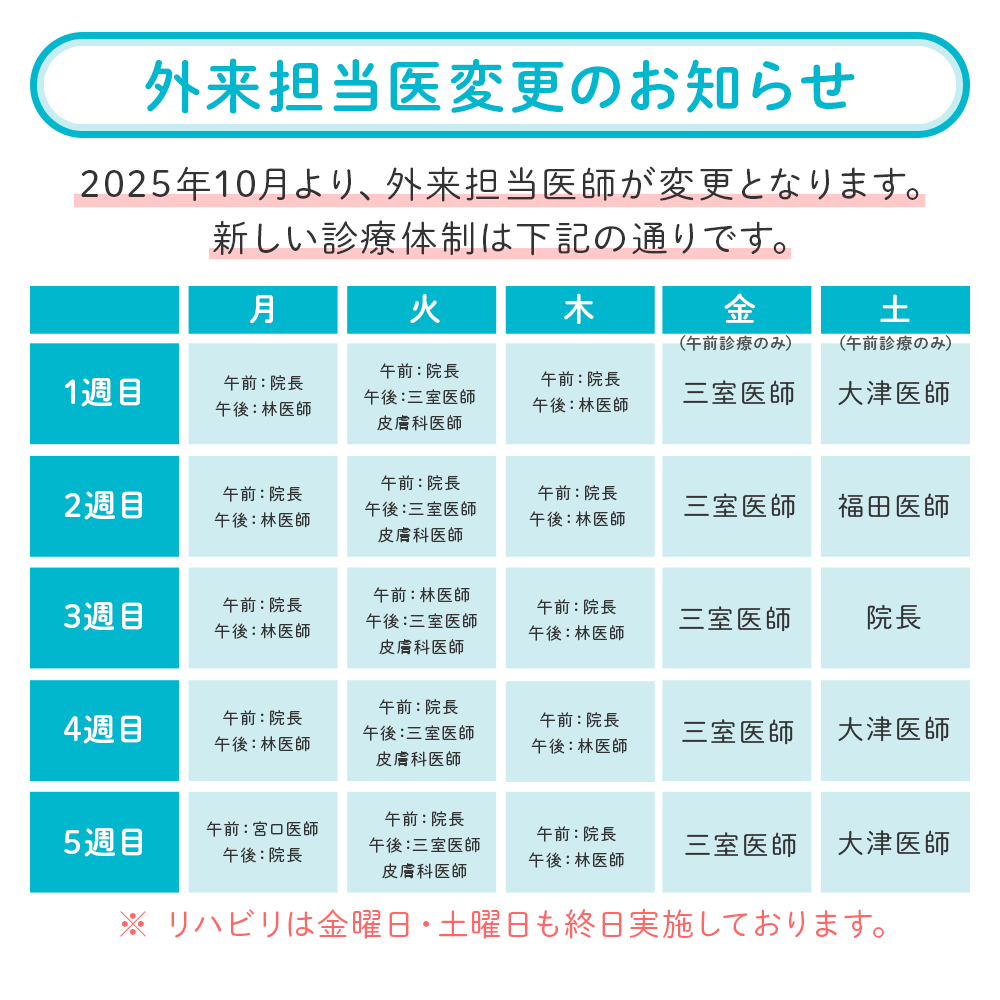 お知らせ 【2025年10月より】外来担当医変更のお知らせ ともクリニックのホームページをご覧いただきありがとうございます。 2025年10月より、外来担当医の変更がございます。 ご確認のほど、よろしくお願い致します。